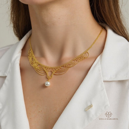 Collier ras du cou en dentelle dorée et perles d'eau douce