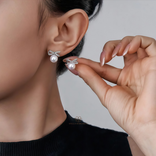 Clous d'oreilles en perles Akoya avec ruban argenté